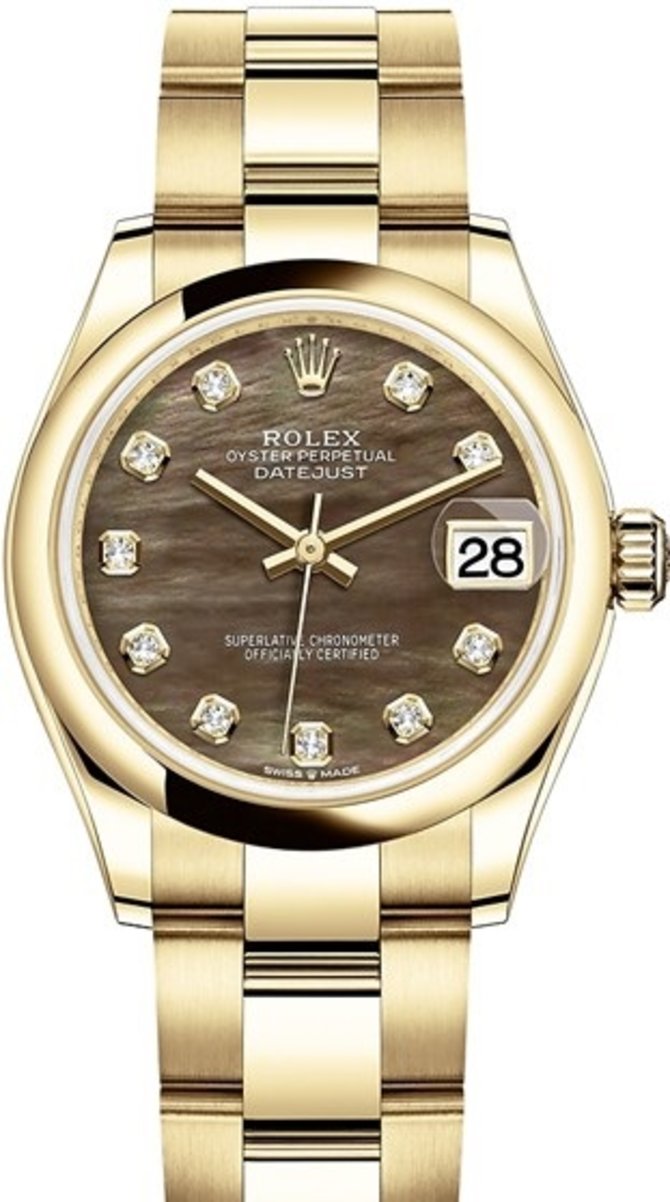 Швейцарская компания Rolex представила классические ювелирные часы для женщин Datejust 31mm Yellow Gold 278248-0037. Главные особенности этой модели - наличие сертификата хронометра COSC, часовая разметка из бриллиантов, натуральный перламутровый циферблат, циклопная линза на индикаторе даты для увеличения показаний. Запас хода механизма 2236 с автоподзаводом рассчитан на 55 часов работы без подзавода. На циферблате золотыми стрелками показывается текущее время. Циферблат защищен стеклом из сапфирового кристалла. Корпус и браслет выполнены из желтого 18-каратного золота. Герметичность корпуса на уровне 100 метров (10 бар).