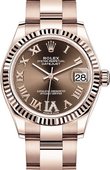Внутри корпуса модели Datejust 31mm Everose Gold 278285rbr-0012 от знаменитой мануфактуры Rolex установлен автоматический калибр с автоматическим подзаводом, мануфактурной разработки мастеров Rolex. На сатинированном циферблате коричневого цвета видна надпись "Superlative Chronometer Officially Certified", которая подтверждает, что механизм этих наручных часов успешно прошел тестирование на протяжении 15 дней на базе COSC - официального швейцарского института хронометрии. Отметим, что COSC - независимая некоммерческая ассоциация. Корпус, диаметром 31 мм, выполнен из розового золота и украшен белыми бриллиантами. 10 бриллиантов на циферблате выполняют роль часовых меток. Стрелки сделаны из золота.