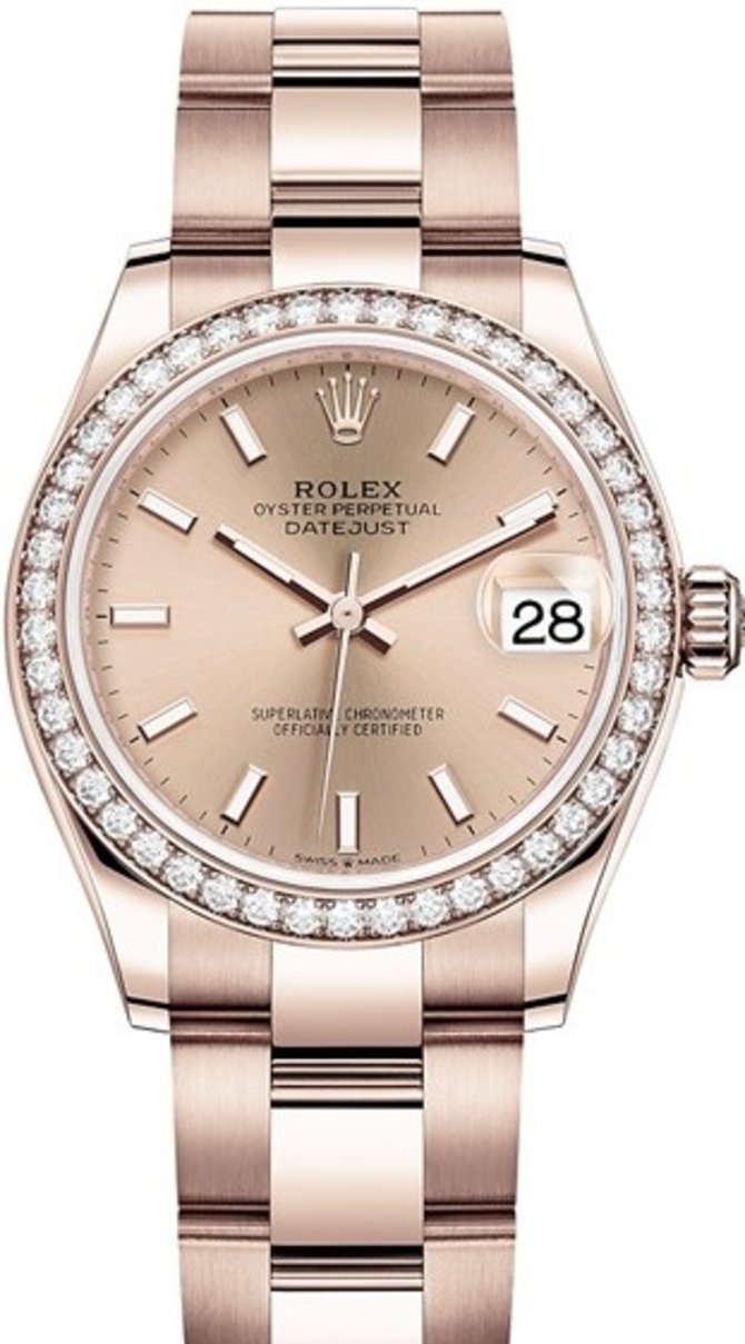 Швейцарские часы от компании Rolex - Rolex Datejust Datejust 31mm Everose Gold 278285rbr-0017, выпущены в круглом корпусе из полированного 18-каратного розового золота в диаметре 31 мм, безель которого украшен белыми бриллиантами классического типа. Корпус имеет водонепроницаемость, позволяющую погружать часы до 100 метров глубины. Внутри находится механизм с автоматическим подзаводом 2236 мануфактурной разработки специалистов Rolex, который отличается запасом хода на 55 часов и сертификатом хронометрической точности хода от швейцарского института тестирования хронометров COSC. Данные часов, минут, секунд и даты показываются на золотистом циферблате стрелками из золота, указывающими на золотую разметку с люминесцентным покрытием. На руке часы фиксируются фирменным браслетом Oyster из розового золота с раскладывающейся застежкой.