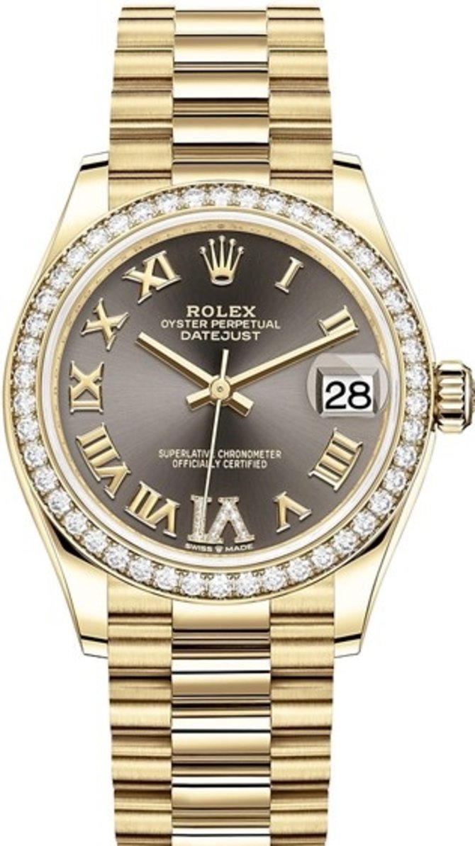 Женские механические часы Datejust 31mm Yellow Gold 278288rbr-0026 представлены швейцарской маркой Rolex в круглом корпусе из желтого 18-каратного золота. Также из желтого 18-каратного золота в этих часах сделаны браслет President, раскладная застежка, римские цифры на циферблате, логотип Rolex на 12-часовой отметке, стрелки, заводная головка. Цифра VI инкрустирована натуральными бриллиантами. Стекло сапфировое. Автоматический мануфактурный механический калибр 2236 отмечен сертификатом сверхточного хронометра от COSC. Водонепроницаемость корпуса - 100 метров. На циферблате отображаются часы, минуты, секунды и дата. Индикатор даты накрыт циклопной линзой.