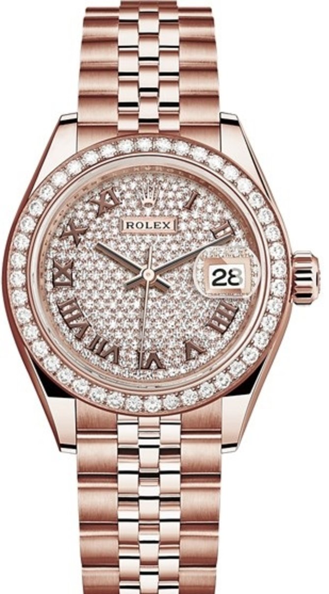 Корпус из чистого розового 18-каратного золота швейцарских часов Rolex Datejust 28 mm Everose Gold 279135rbr-0022 инкрустирован натуральными белыми бриллиантами. Циферблат с золотыми стрелками и римской разметкой полностью инкрустирован бриллиантами и накрыт сапфировым кристаллом с противобликовым эффектом. Механизм отмечен престижным официальным сертификатом сверхточного хронометра COSC (швейцарский институт тестирования хронометров). Основные функции: индикация даты сквозь фирменную циклопную линзу и текущего времени. Фирменный золотой браслет JUBILEE изготовлен из розового золота и оснащен раскладной застежкой. Герметичность ювелирного корпуса - 100 метров. На бриллиантовом циферблате установлены стрелки и римская разметка из золота.