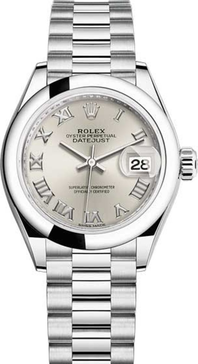Элегантные женские часы Rolex Datejust 28 mm Platinum 279166-0007 с римскими цифрами из платины, установленными в качестве часовых меток. Над индикатором даты установлена циклопная линза - специальное увеличительное стекло, увеличивающее показание даты. Корпус и браслет сделаны из полированной платины. Водонепроницаемость корпуса на высоком уровне - 100 метров. Автоматический механизм Rolex, установленный здесь, наделен сертификатом сверхточного хронометра от COSC. Работает от автоматического подзавода; обладает 55 часами запаса хода. Защищает сатинированный циферблат стекло из сапфирового кристалла. Диаметр корпуса - 28 миллиметров.