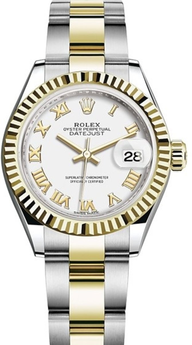 Изысканная модель женских швейцарских часов Datejust 28 mm Steel and Yellow Gold 279173-0024 от швейцарской мануфактуры Rolex обладает 28-миллиметровым комбинированным корпусом из 18-каратного желтого золота и нержавеющей стали, созданном в диаметре 31 мм. Фирменный браслет Oyster, который отличается плоскими трехрядными звеньями, выполнен в той же комбинации металлов, что и корпус. Безель из желтого золота с нанесением рифлирования. Стрелки, заводная головка с логотипом марки Rolex, а также римские цифры на белом циферблате сделаны из желтого золота. Стекло, которым накрыт циферблат, представлено из сапфирового кристалла с двойным антибликовым покрытием. Герметичность корпуса - 100 метров. Автоматический мануфактурный механизм отмечен официальным сертификатом хронометра COSC. Его запас хода - 55 часов.