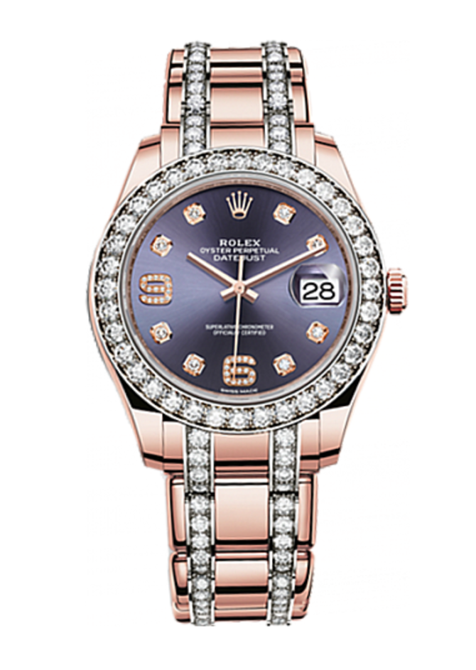 В 2016 году легендарная швейцарская часовая мануфактура Rolex пополнила коллекцию "Datejust" моделью уникальных швейцарских часов "Pearlmaster Everose Gold 39 mm". Само название часов гласит о том, что 39-миллиметровый корпус выполнен из 18-каратного розового золота. Корпус внутри себя содержит мануфактурный швейцарский механизм с автоподзаводом, гарантирующий индикацию на циферблате таких данных: часов, минут, секунд и дату. Калибр отмечен официальным сертификатом хронометра. Запас хода механизма - минимум 70 часов. Браслет из розового золота с раскладывающейся застежкой зафиксирует часы на руке владельца или владелицы. Корпус имеет достаточно высокую герметичность -100 метров. Индикатор даты оснащен увеличивающей (циклопной) линзой. Безель корпуса, браслет, цифры и часовые метки циферблата украшены бриллиантами.