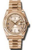 Часы Day-Date во внушительном корпусе, представленные широкой публике в 2008 году, воплощают в себе уникальное наследие Day-Date. Они стали первыми часами, показывающими полное название дней недели. В этой уникальной модели, которую предпочитают мировые лидеры, индикация дней недели в дугообразном окошке осуществляется на многих языках. Дисковый механизм календаря дат и дней недели в полной мере отражает изобретательность своих создателей. Смена дня недели и даты происходит ровно в полночь и практически мгновенно, в соответствии с безупречными стандартами качества Rolex. Day-Date 118235 изготовлены из 18 к. розового золота. На коричневом циферблате модели размещены 8 высококачественных бриллиантов, 2 рубина.