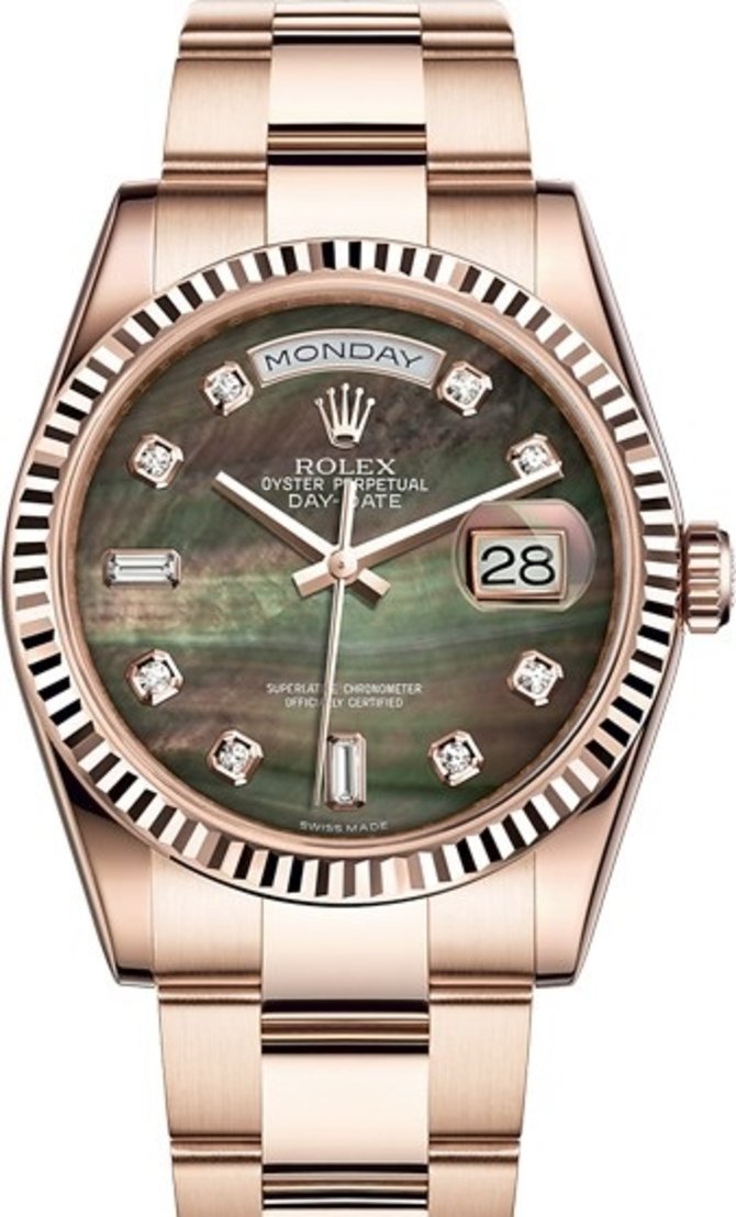 Из полированного фирменного розового золота Everose Gold представлены швейцарские часы для женщин Day-Date 36mm Everose Gold 118235f-0062 с жемчужным циферблатом, где на месте меток часов установлены бриллианты белого цвета классической огранки. Сапфировое стекло с антибликовым покрытием и вставкой циклопной линзы на уровне индикатора текущей даты установлено для защиты циферблата от повреждений разного характера. Браслет изготовлен из розового золота. Застежка раскладного типа сделана из золота. Часы работают на механизме производства Rolex с высоким запасом хода - на 70 часов. Сертификат сверхточного хронометра выдан COSC (коммерческим швейцарским институтом хронометрии) для подтверждения хронометрической точности хода.