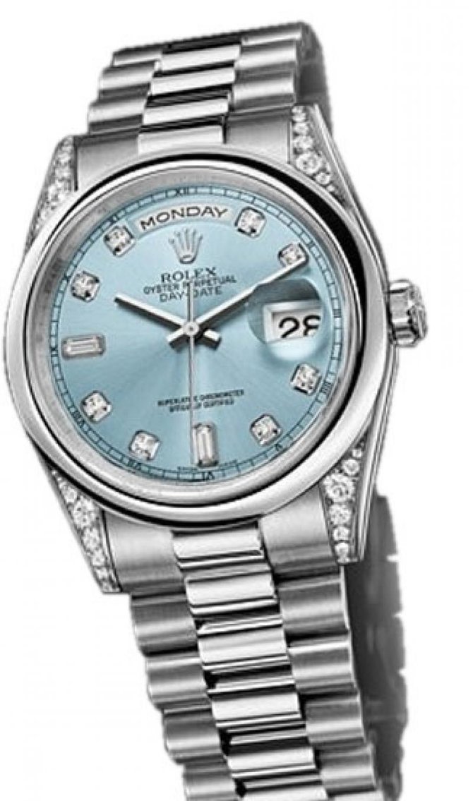 Представленная вашему вниманию модель может похвастаться платиновыми корпусом и браслетом. Корпус также инкрустирован 32-мя белыми бриллиантами, идеально сочетающимися с 10 бриллиантами на голубом циферблате.