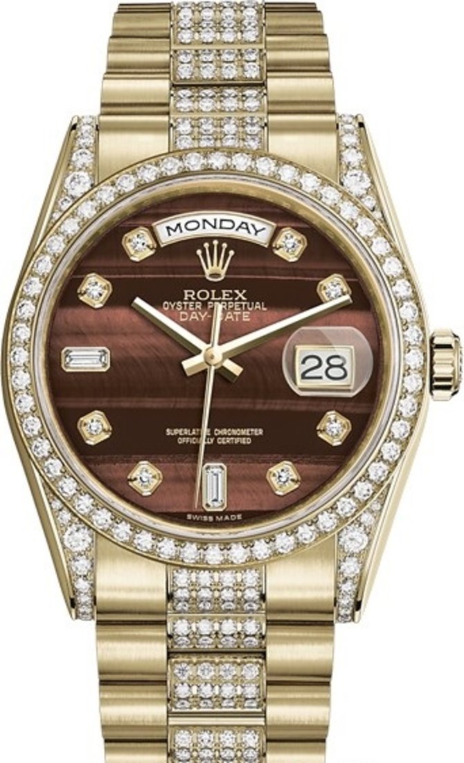 Коричневый сатинированный циферблат наручных механических часов от швейцарского бренда Rolex (модель Rolex Day-Date Day-Date 36mm Yellow Gold 118388-0128) защищен стеклом из сапфирового кристалла с противобликовыми свойствами. Стрелки выполнены из чистого желтого золота. Часовые метки - это натуральные бриллианты. Автоматический мануфактурный механизм 3255 производства Rolex имеет запас хода на 72 часа, а его хронометрическая точность подтверждена сертификатом швейцарского института хронометрии COSC. Водонепроницаемость золотого корпуса составляет 100 метров. Золотой браслет укомплектован раскладывающейся застежкой. Диаметр корпуса 36 миллиметров идеально подойдет для женской руки.