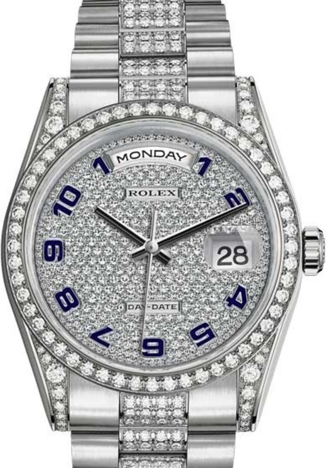 На роскошном бриллиантовом циферблате установлены арабские цифры с покрытием люминесцентным составом синего цвета. Стрелки из белого золота также покрыты синим люминесцентным составом, который светится в темноте с целью хорошей читабельности данных в любой атмосфере. Защищен ювелирный циферблат сапфировым стеклом с многослойным антибликовым покрытием. Корпус со 100 метрами герметичности и браслет с раскладывающейся застежкой изготовлены из белого золота. И корпус, и браслет украшены бриллиантами. Автоматический калибр с официальным сертификатом хронометра COSC. Функции часов: часы, минуты, секунды, дата, день недели. Механизм с запасом хода 70 часов.