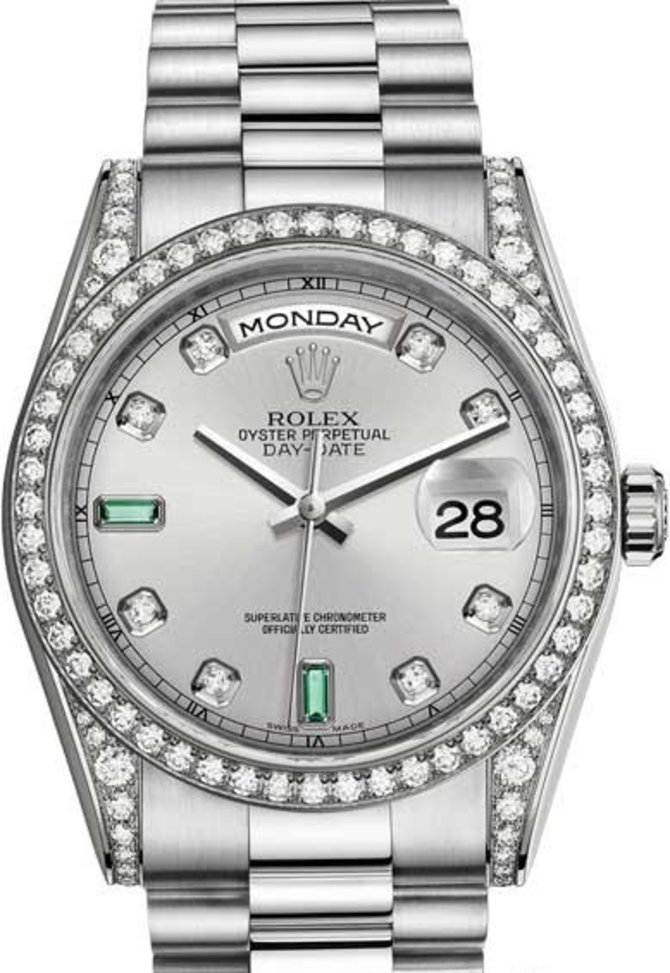 Корпус: белое золото, диаметр 36 мм, герметичность 100 метров. Браслет: белое золото с раскладной пряжкой. Инкрустация: белые бриллианты классической огранки. Циферблат: белые бриллианты разных огранок, 2 рубина, стрелки из золота. Стекло: сапфировый кристалл с антибликовым покрытием+увеличительная циклопная линза над индикатором даты. Механизм: автоматический подзавод, запас хода - до 70 часов, сертификат хронометра COSC. Бренд: Rolex. Коллекция: Day-Date.