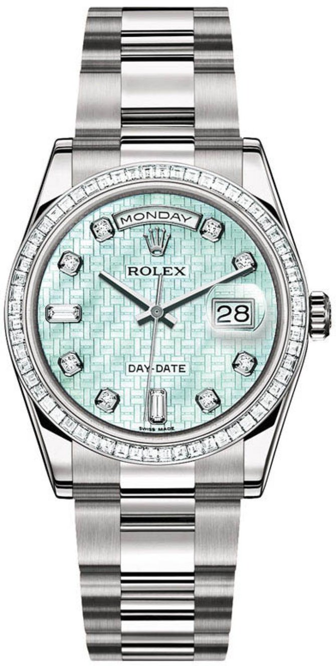 Золотое «платье», жемчуг и радужные драгоценные камни – все это черта новых часов от ROLEX - Oyster Perpetual Day-Date «Sertie». Новые часы отличаются богатством и изысканностью. Часовые метки в виде бриллиантов, гильошированный циферблат и окно даты с увеличительным сапфировым стеклом. Механизм автоматический, калибр 3135, часы прошли испытания как хронометр в COSC, полностью нечувствительны к магнитным полям, синяя спираль Parachrom из эксклюзивного сплава, запатентована ROLEX, имеет высокую устойчивость к изменениям температуры и до 10 раз более точная, чем традиционные спирали. Диаметр корпуса 36 мм, состоит из 18К белого золота. Безель инкрустирован белыми бриллиантами багетной формы. Водонепроницаемость 100 м. Заводная головка защищена запатентованной двойным уплотнителем Twinlock. Сапфировое стекло.