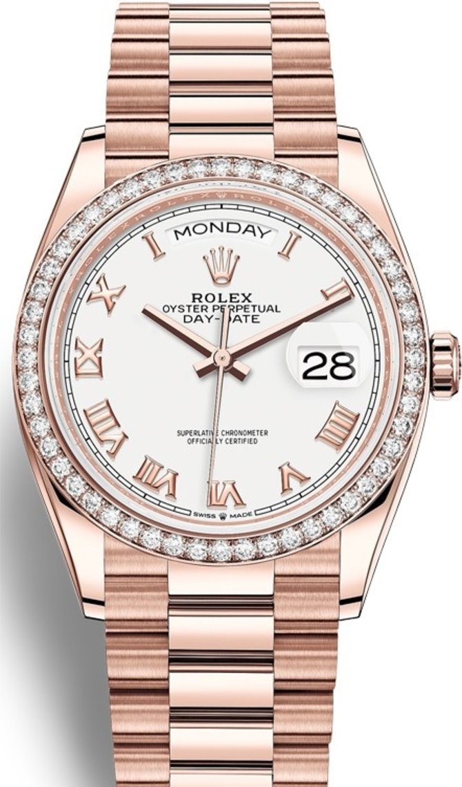 На базе мануфактурного механического калибра 3255 со статусом хронометра швейцарского института хронометрии COSC компанией Rolex представлены наручные часы Day-Date 36mm Everose Gold 128345rbr-0054. Корпус выполнен из розового золота в диаметре 36 мм. Запас хода рассчитан на 70 часов. На белом циферблате указываются часы, минуты, секунды, дата, день недели. Безель инкрустирован бриллиантами. Циферблат защищен сапфировым стеклом с противобликовым составом. Циклопная линза, запатентованная Rolex-ом, служит для увеличения показаний даты. Золотой браслет дополнен раскладной застежкой и украшен белыми бриллиантами классической огранки. Часовая разметка и стрелки сделаны из золота. Водонепроницаемость корпуса рассчитана на 100 метров.