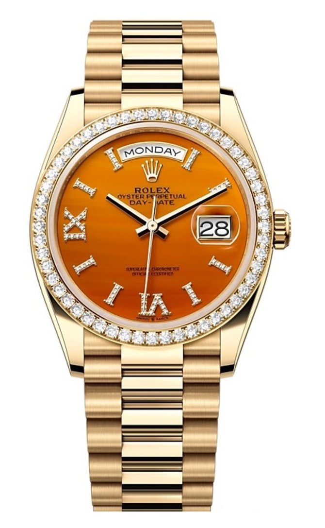 Женские швейцарские часы часы Rolex Day-Date 36mm Yellow Gold 128348rbr-0049 имеют круглый 36-миллиметровый корпус из желтого золота, украшенный белыми бриллиантами. В корпусе заключен автоматический калибр 3255 с запасом хода на 70 часов, статусом хронометра, способствующий индикации таких данных: часы, минуты, секунды, дата, день недели. Под сапфировым стеклом с антибликовым покрытием установлены стрелки для индикации текущего времени, а также римские цифры, инкрустированные бриллиантами. Индикатор даты накрыт циклопной линзой, служащей для увеличения показаний. Браслет и раскладная застежка сделаны из желтого золота. Водонепроницаемость корпуса - 100 метров. Год выпуска данной модели - 2023.