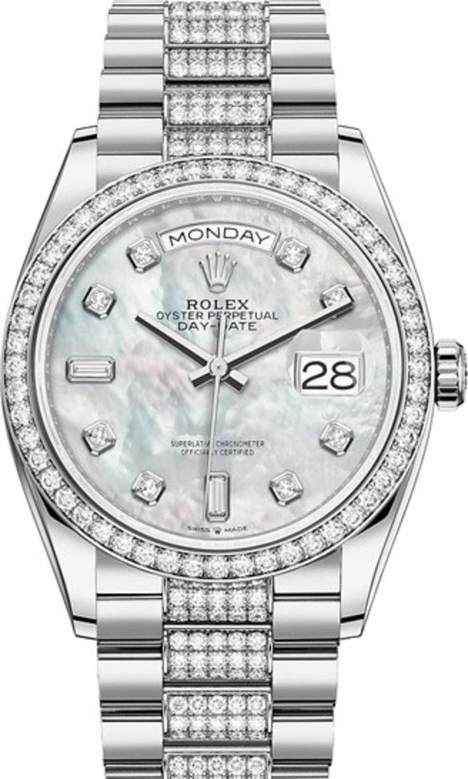 Многофункциональная модель швейцарских часов для женщин Rolex Day-Date 36mm White Gold 128349rbr-0014 представлена в ювелирном корпусе из белого золота, диаметром 36 мм, с инкрустацией бриллиантами белого цвета классической огранки. Браслет типа PRESIDENT с полукруглыми трехрядными звеньями сделан из белого золота и украшен бриллиантами классической огранки. Перламутровый циферблат голубого оттенка способствует индикации времени, даты, дней недели. Часовая разметка состоит из белых бриллиантов классической и багетной огранки. Механизм был разработан и собран компанией с мировым именем Rolex. Он отмечен сертификатом хронометра. Запас хода - 70 часов. Корпус имеет повышенную водонепроницаемость - 100 метров. Стекло, накрывающее циферблат для его защиты, сделано из сапфирового кристалла. Модель выпущена в 2019 году.