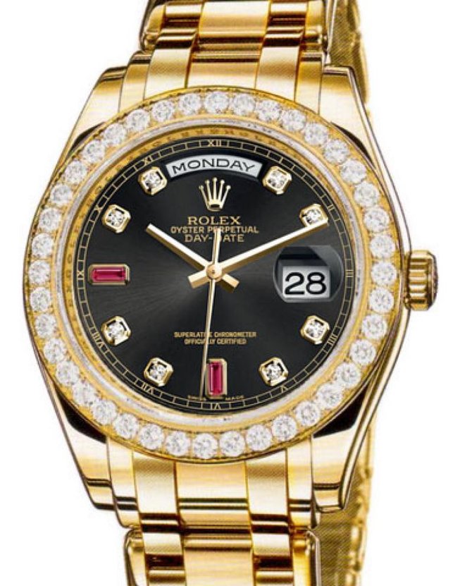 Практически сразу после выхода в 1956 году швейцарские часы Day‑Date получили статус часов, созданных для влиятельных людей. Часы Day‑Date были первыми наручными часами, вышедшими с календарем и показывающими название дней недели в полном объеме. Модели Day‑Date производятся только из платины и золота. Данная модель сделана из желтого золота. Безель роскошно украшен 40 бриллиантами. На циферблате расположены 8 бриллиантов и 2 багетных рубина. Браслет Pearlmaster из желтого золота с раскладывающейся застежкой Crownclasp. На данный момент компанией Rolex выпущено, примерно, 10 миллионов оригинальных швейцарских часов, не учитывая подделок. Множество фальшивок говорит об успехе, процветании и влиятельности бренда.