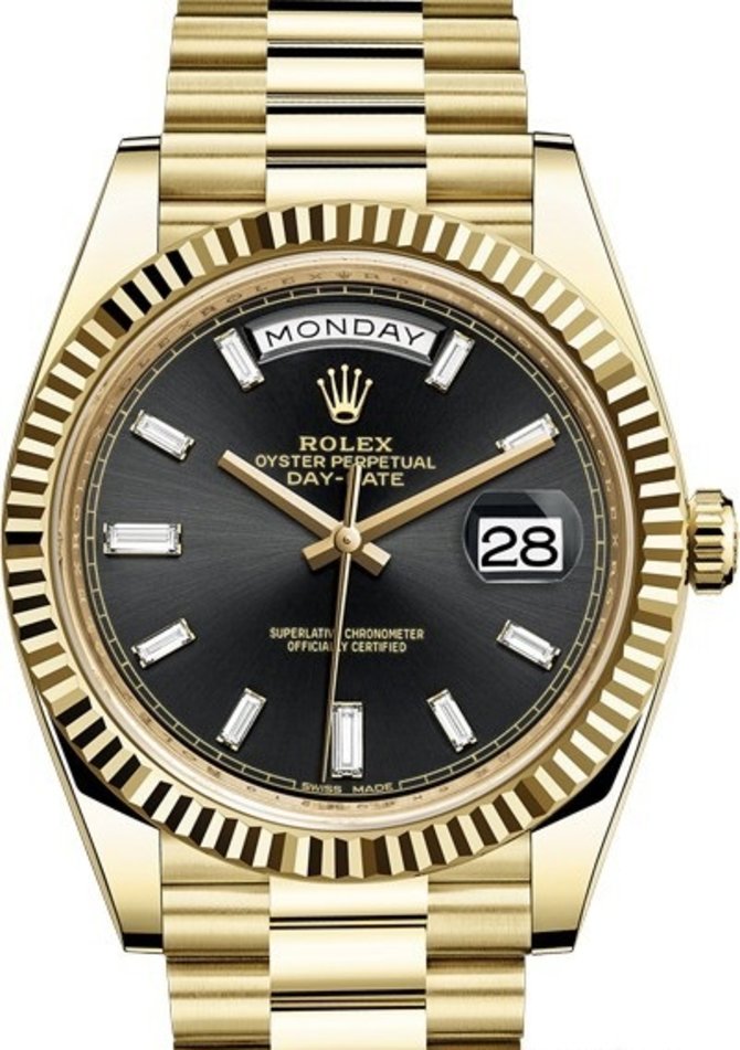 Часовая компания из Швейцарии Rolex представляет наручные часы со статусом хронометра Day-Date 40 mm Yellow Gold 228238-0004. Новинка выпущена в корпусе из желтого золота, диаметром 40 мм. Внутри него установлен автоматический мануфактурный калибр с запасом хода на 48 часов работы. Он обеспечивает индикацию времени, дней недели и даты на сатинированном черном циферблате, где часовая разметка представлена из бриллиантов багетной огранки. Браслет выполнен из желтого золота и оснащен раскладной застежкой. Сапфировое стекло с антибликовым покрытием установлено для защиты циферблата от повреждений. Рифленый безель выполнен из золота. Стрелки также представлены из золота. Индикатор даты оснащен циклопной линзой. Водостойкость корпуса - 100 метров.