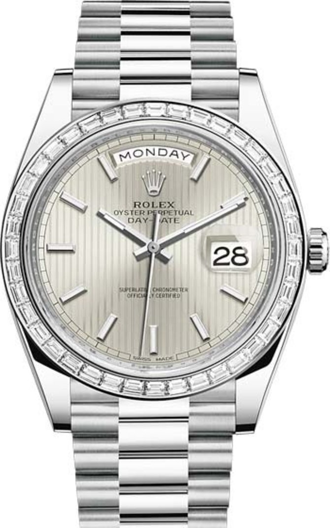 С помощью покрытия люминесцентном часовых меток и стрелок наручных часов Rolex Day-Date Day-Date 40 mm Platinum 228396tbr-0022 четко видны показания времени в ночное время суток. Прочное лицевое стекло, немного выпуклое вперед, выполнено из натурального сапфирового кристалла с антибликовыми свойствами. Корпус и браслет изготовлены из благородного металла - платины. Безель инкрустирован багетными бриллиантами белого цвета. Застежка раскладного типа - в комплекте. Внутри 40-миллиметрового корпуса был установлен сверхточный механизм, разработанный и собранный специалистами швейцарской мануфактуры Rolex. Модель отличается 100-метровой водонепроницаемостью. Установленный в часах калибр отмечен сертификатом хронометрической точности от швейцарского института хронометрии COSC. Запас хода механизма рассчитан на 70 часов работы без подзавода.