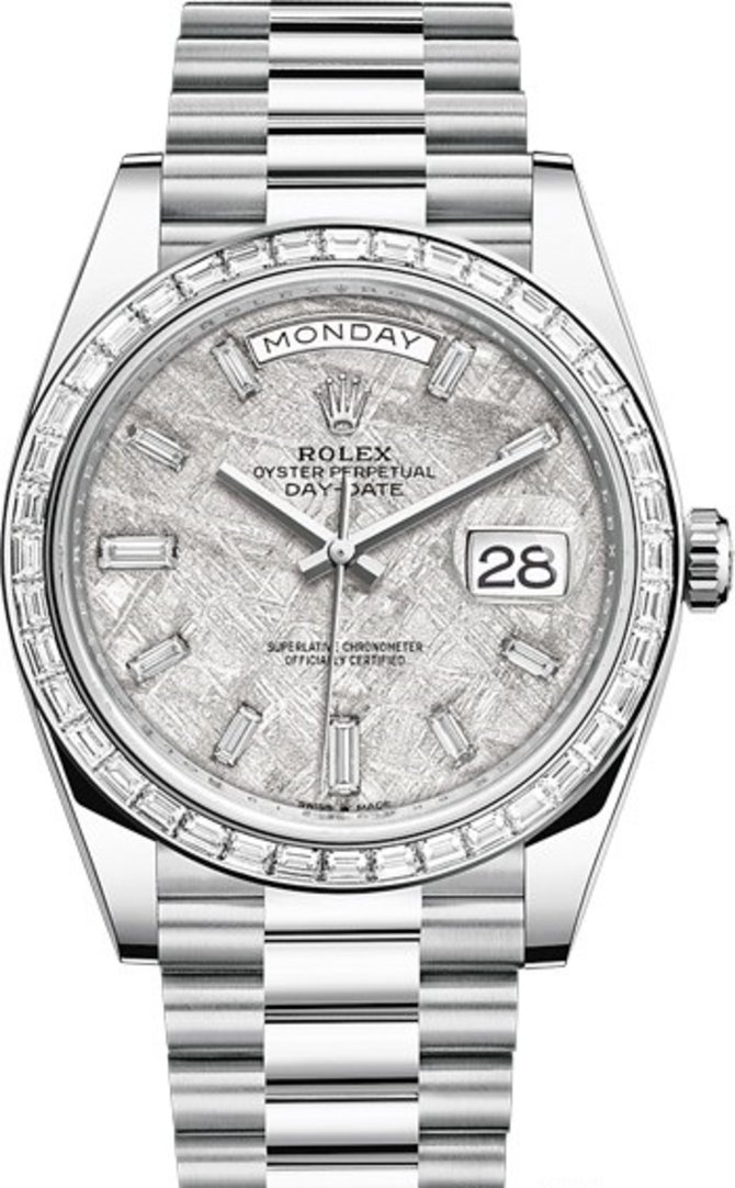 Полированный круглый элегантный корпус швейцарских часов Rolex Day-Date Day-Date 40 mm Platinum 228396tbr-0027 был изготовлен из фирменной платины, отличающейся неприродно ярким блеском. Диаметр корпуса составляет 40 мм. Механизм, установленный внутри платинового мануфактурного корпуса, оснащен ротором автоматического подзавода, запасом хода на 3 суток работы, а также сертификатом хронометрической точности хода. Сертификат выдан престижным швейцарским институтом хронометрии COSC после прохождения 15-дневного тестирования. Водонепроницаемость корпуса доходит до 100 метров глубины. Браслет, оснащенный системой быстрого удлинения, выполнен из платины. Раскладная застежка также платиновая.