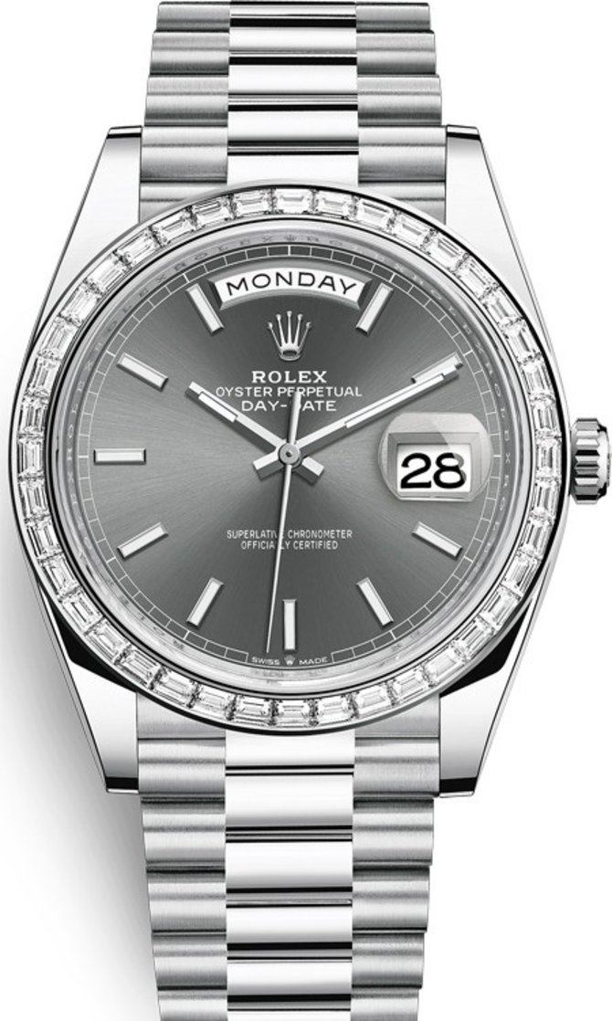 На базе мануфактурного механического калибра 3255 со статусом хронометра от швейцарского института хронометрии COSC компанией Rolex представлены наручные часы Day-Date 40 mm Platinum 228396tbr-0031. Корпус выполнен из платины в диаметре 40 мм. Запас хода рассчитан на 70 часов. На сатинированном циферблате указываются часы, минуты, секунды, дата, день недели. Безель инкрустирован багетными бриллиантами. Циферблат защищен сапфировым стеклом с противобликовым составом. Над индикатором даты установлена циклопная линза для увеличения показаний. Часовые метки и стрелки покрыты люминесцентным составом, что светится в темноте. Браслет из платины дополнен раскладной застежкой. Водонепроницаемость корпуса рассчитана на 100 метров.