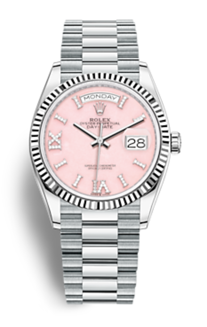 Rolex Day-Date m128236-0006 - швейцарские мануфактурные часы в круглом корпусе из платины, диаметром 36 мм. Безель рифленый. Часовая разметка инкрустирована белыми классическими бриллиантами. На розовом циферблате, что находится под надежной защитой сапфирового стекла с антибликовым покрытием, показываются часы, минуты, секунды и дата. Запатентованная Rolex циклопная линза, размещенная над индикатором даты, увеличивает показания. Платиновый браслет укомплектован раскладывающейся застежкой. Корпус герметичен до 100 метров. Мануфактурный калибр Rolex 3255 имеет 70 часов запаса хода.