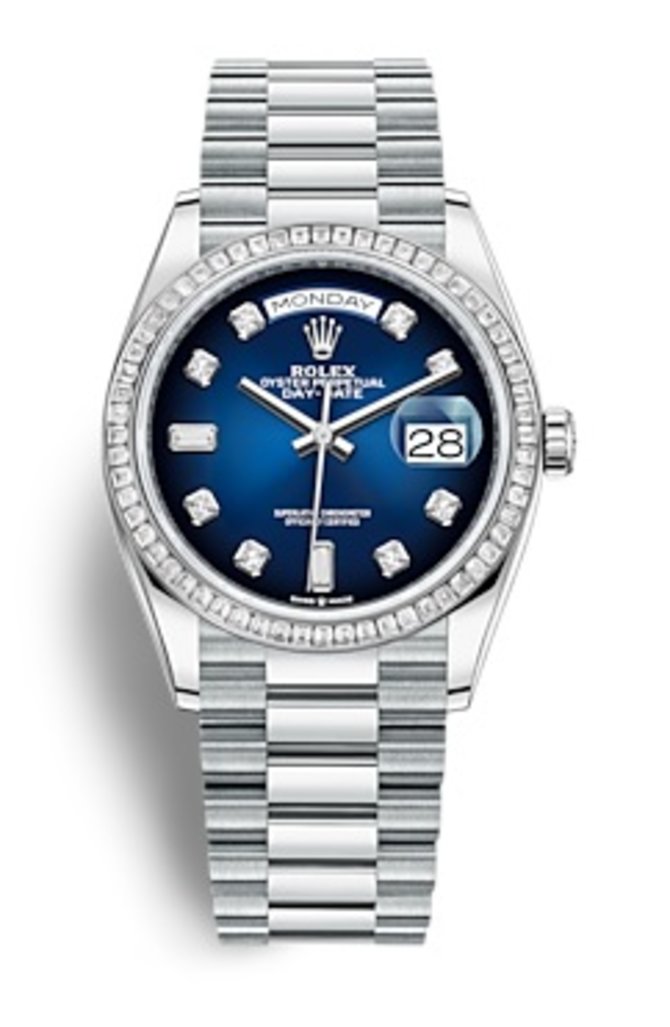 Компания Rolex представляет модель наручных часов DAY-DATE 36 m128396tbr-0008 в 36-миллиметровом корпусе из платины. Часы работают на базе мануфактурного калибра 3255 с автоподзаводом и запасом хода на 70 часов. Данные текущего времени и даты показываются на сатинированном циферблате сквозь защитное стекло из сапфирового кристалла с противобликовым покрытием. Циклопная линза, увеличивающая показания, закрывает индикатор даты. Белыми бриллиантами классической огранки инкрустирован безель часов, а на циферблате выложена часовая разметка из багетных бриллиантов. Браслет из платины фиксируется на запястье с помощью брендовой раскладывающейся застежки. Уровень водонепроницаемости корпуса - до 100 метров.