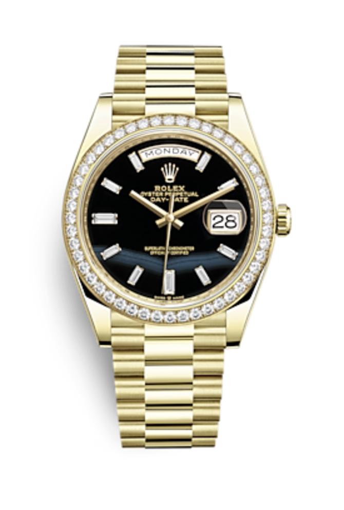 Ювелирные швейцарские наручные часы Rolex Day-Date Yellow gold and Diamonds m228348rbr-0039 в корпусе из желтого 18-каратного золота, диаметром 40 мм. Безель инкрустирован белыми бриллиантами классической огранки. Белые бриллианты багетной огранки установлены в качестве часовой разметки. На черном циферблате, защищенном надежным сапфировым стеклом с антибликовым покрытием, показываются данные текущего времени, даты и дней недели. Запатентованная Rolex-ом циклопная линза, установленная над индикатором даты, увеличивает показания. Браслет из желтого золота укомплектован брендовой раскладывающейся застежкой Crownclasp. Механический мануфактурный часовой механизм Rolex 3255 обладает функцией автоподзавода и запасом хода на 70 часов работы без подзавода. Герметичность корпуса - 100 метров.