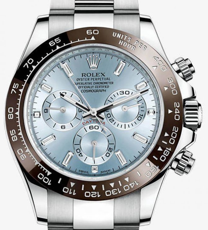 Новинка 2014. Rolex представляет новый вариант Oyster Perpetual Cosmograph Daytona Platinum, подчеркивающий утонченность платины 950-й пробы. Циферблат голубого цвета, с солнечным переливом и багетными бриллиантами вместо меток, счетчики хронографа серебристо-голубого цвета, эксклюзивного и редкого оттенка, предназначенного для моделей Rolex из платины. В модели Cosmograph Daytona установлен калибр 4130, механизм хронографа с вертикальным расположением шестеренок и автоматическим подзаводом, полностью разработанный и изготовленный мастерами Rolex. Как все механизмы Rolex Perpetual, калибр 4130 имеет сертификат швейцарского хронометра, выдаваемый сверхточным часам, успешно прошедшим тестирование в Официальном швейцарском институте хронометрии (COSC). Его концепция и качество изготовления придают этой модели несравненную точность и надежность. Осциллятор – подлинное сердце часов – оснащен синей спиралью баланса Parachrom, запатентованной Rolex и изготовленной из особого сплава ниобия и циркония. Абсолютно невосприимчивая к магнитным полям, эта спираль может противостоять термическим воздействиям и сохранять точность при ударах в десять раз лучше, чем обычная спираль.