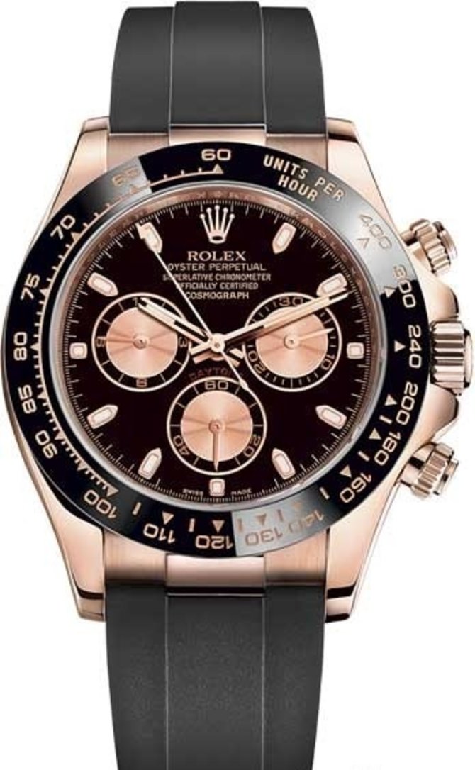 Модель швейцарских часов Rolex Daytona Cosmograph Daytona 40mm Everose Gold 116515ln-0012 представлена с механизмом 4130, который имеет сертификацию СOSC как сверхточный часовой механизм - хронометр. Корпус круглой формы изготовлен из розового 18-каратного золота. Циферблат темно-коричневого цвета делится на 4 зоны индикации: основную центральную, где показываются золотыми стрелками с люминесцентным составом часы, минуты, секунды; немного ниже центра расположены 3 счетчика хронографа. На безеле расположилась тахиметрическая шкала, благодаря которой владелец часов сможет измерять скорость движения автомобиля. Черный ремешок выполнен из каучука и оснащен прочной золотой пряжкой. Механизм сертифицирован как хронометр. Водонепроницаемость корпуса - 100 метров.