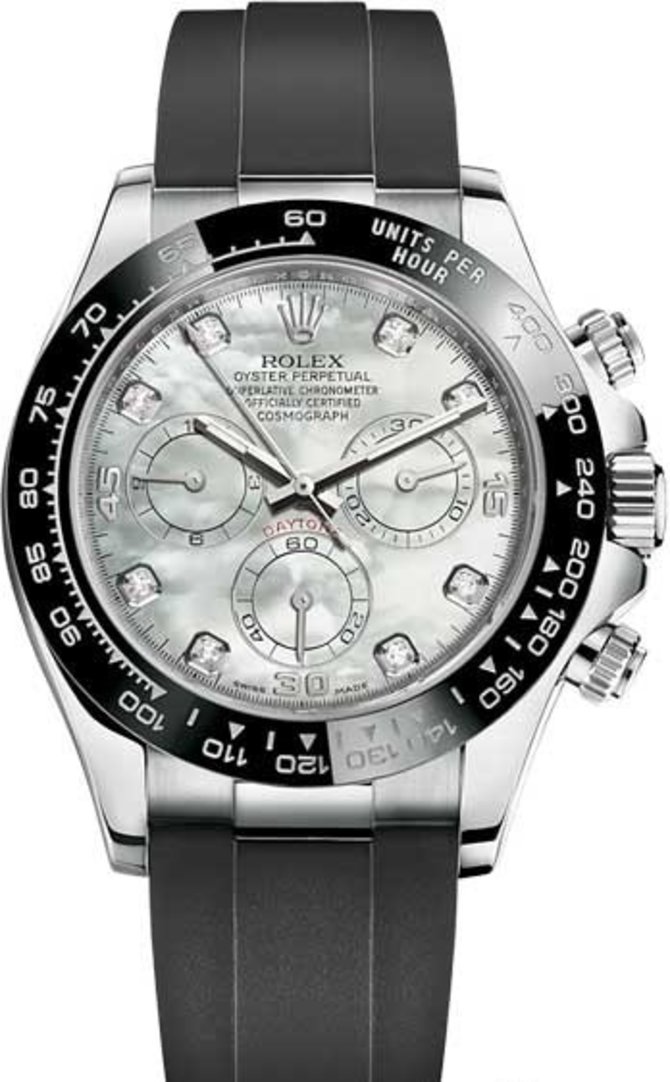 Перламутровый циферблат наручных часов Rolex Daytona Cosmograph Daytona 40mm White Gold 116519ln-0023 украшен бриллиантами, которые заменяют часовые метки. Швейцарские часы Rolex Daytona выпускаются для настоящих автогонщиков. Часы оснащены функцией хронографа и тахиметрической шкалой. Это позволяет измерять скорость движения авто до 400 единиц в час. Из полированного белого золота сделан круглый часовой корпус. Внутри корпуса со 100-метровым уровнем герметичности находится механизм с автоподзаводом и 72-часовым запасом хода, разработанный Rolex-ом. Его хронометрическую точность хода подтверждает официальный сертификат от COSC - швейцарского института хронометрии. Стекло на лицевой части корпуса выполнено из сапфирового кристалла.