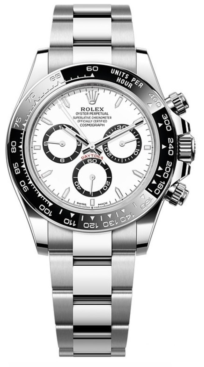 Мужские швейцарские часы часы Rolex Daytona Cosmograph 40 mm Steel 126500ln-0001 имеют круглый 40-миллиметровый корпус из нержавеющей стали. На безель нанесена тахиметрическая шкала. В корпусе заключен автоматический калибр4131 с запасом хода на 72 часа, а также с функцией хронографа. Под сапфировым стеклом с антибликовым покрытием установлены стрелки для индикации текущего времени с люминесцентным покрытием, счетчики хронографа. Браслет и раскладная застежка сделаны из нержавеющей стали. Водонепроницаемость корпуса - 100 метров. Год выпуска данной модели - 2023.