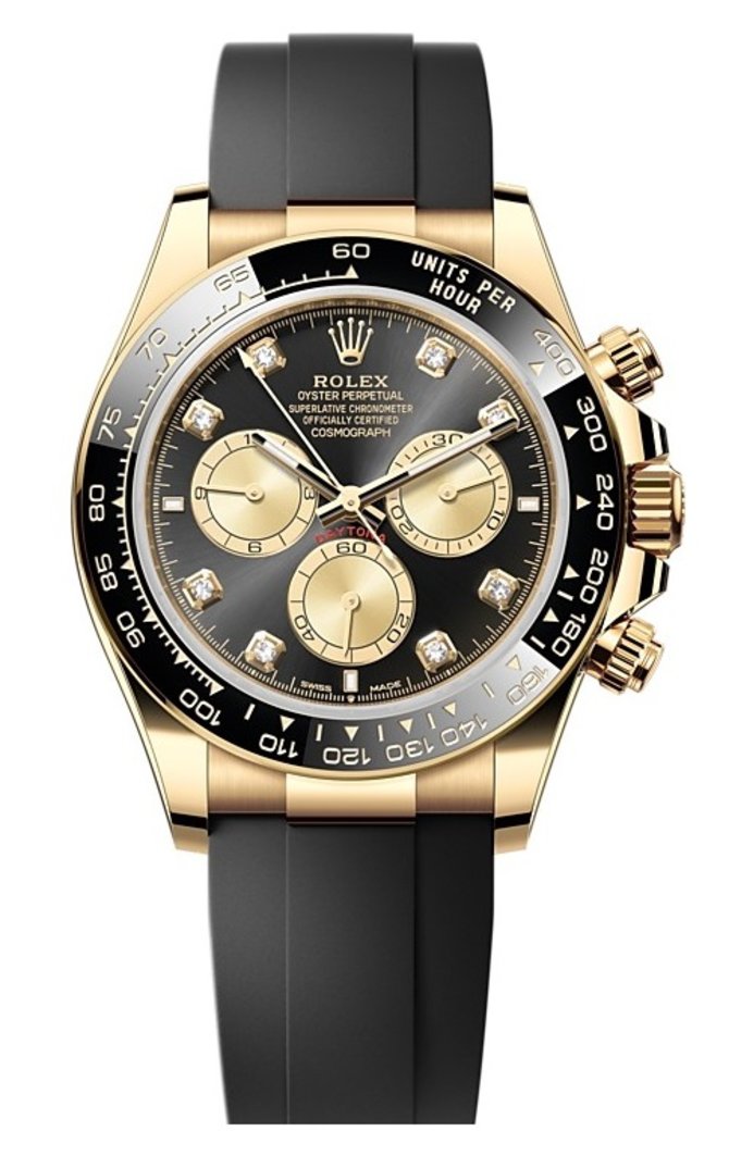 Мужские швейцарские часы с функцией хронографа от компании Rolex, модель Cosmograph Daytona 40 mm Yellow Gold 126518ln-0006, представлены в круглом корпусе из желтого золота. На запястье руки часы фиксируются каучуковым ремешком с застежкой из желтого золота. Под стеклом из сапфирового кристалла с антибликовым покрытием показываются часы, минуты, секунды, данные хронографа. Часовые метки выложены бриллиантами. На керамическом безеле расположена тахиметрическая шкала. Стрелки покрыты люминесцентным составом, который светится в темноте. Установленный мануфактурный механизм 4130 с автоматическим подзаводом отличается запасом хода на 72 часа работы без подзавода, а также сертификатом хронометрической точности хода. Водонепроницаемость корпуса - 100 метров. Модель Cosmograph Daytona 40 mm Yellow Gold 126518ln-0006 выпущена мануфактурой Rolex в 2023 году.