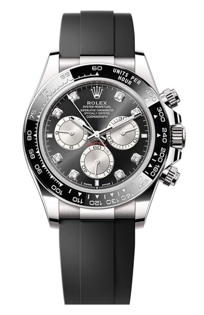 Мужские швейцарские часы с функцией хронографа от компании Rolex, модель Cosmograph Daytona 40 mm White Gold 126519ln-0004, представлены в круглом корпусе из белого золота. На запястье руки часы фиксируются каучуковым ремешком с застежкой из белого золота. Под стеклом из сапфирового кристалла с антибликовым покрытием показываются часы, минуты, секунды, данные хронографа. Часовые метки выложены бриллиантами. На керамическом безеле расположена тахиметрическая шкала. Стрели покрыты люминесцентным составом, который светится в темноте. Установленный мануфактурный механизм 4130 с автоматическим подзаводом отличается запасом хода на 72 часа работы без подзавода, а также сертификатом хронометрической точности хода. Водонепроницаемость корпуса - 100 метров. Модель Cosmograph Daytona 40 mm White Gold 126519ln-0004 выпущена мануфактурой Rolex в 2023 году.