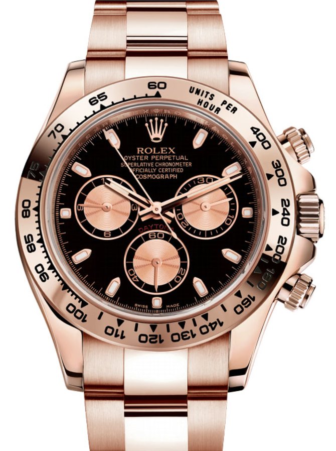 Популярная мировая мануфактура Rolex представила модель швейцарских часов с хронографом. Цельный корпус выполнен из розового 18-каратного золота. Браслет Oyster также из розового золота. Габариты корпуса: 40 мм - диаметр и 11.2 мм - толщина. Такие параметры дают возможность носить часы как женщинам, так и мужчинам. Циферблат защищает прочное сапфировое стекло, устойчивое к царапинам. Циферблат служит для индикации текущего времени и данных счетчиков хронографа. На золотой безель нанесена тахиметрическая шкала, которая позволяет измерять скорость в пределах до 400 единиц в час. Раскладная пряжка с известным именем Oysterlock изготовлена из розового золота. Корпус герметичен до 100 метров глубины. Сверхточный хронограф Cosmograph Daytona выпускался Ролексом еще в 60-х годах для профессиональных автогонщиков. Стоит отметить, что собственное литейное производство бренда Rolex дает возможность выполнять корпусы в пределах мануфактуры, также, как и механизмы. В часах установлен калибр 4130 с автоподзаводом и функцией хронографа. Данный механизм с 72-часовым запасом хода - обладатель почетного сертификата швейцарского хронометра, который выдается институтом COSC. Задняя крышка, а также заводная головка с системой тройной герметизации Triplock - привинчиваемые.