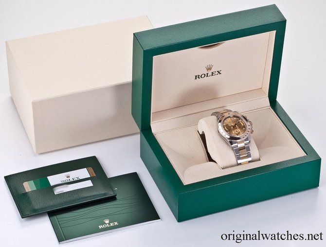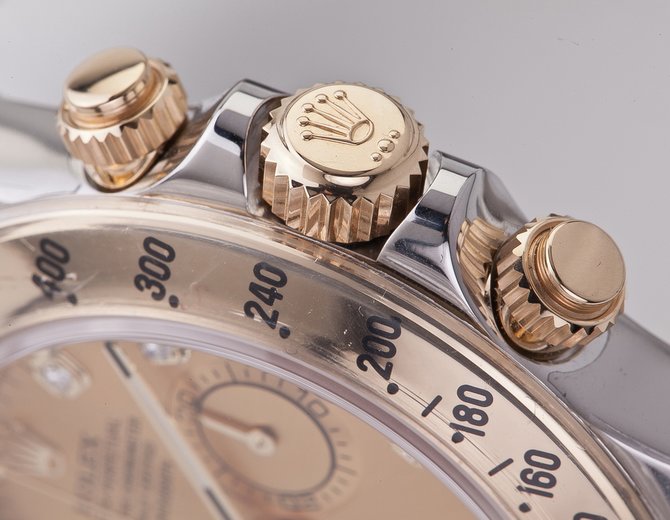 Компания Rolex представила модель швейцарских часов с хронографом. Цельный корпус выполнен из комбинации желтого 18-каратного золота и качественной нержавеющей стали. Известный браслет Oyster произведен из такой же комбинации металлов, что и корпус. Раскладная застежка Oysterlock изготовлена из стали. Часовые метки на циферблате заменяют бриллианты. Габариты корпуса: 40 мм - диаметр и 12.4 мм - толщина. Такие параметры дают возможность носить часы как женщинам, так и мужчинам. В часах установлен калибр 4130 с автоподзаводом и функцией хронографа. Данный механизм с 72-часовым запасом хода - обладатель почетного сертификата швейцарского хронометра, который выдается институтом COSC. Задняя крышка, а также заводная головка с системой тройной герметизации Triplock - привинчиваемые. Циферблат защищает прочное сапфировое стекло, устойчивое к царапинам. Циферблат служит для индикации текущего времени и данных хронографа. На золотой безель нанесена тахиметрическая шкала, которая позволяет измерять скорость в пределах до 400 единиц в час. Корпус герметичен до 100 метров глубины. Сверхточный хронограф Cosmograph Daytona выпускался Ролексом еще в 60-х годах для профессиональных автогонщиков. Стоит отметить, что собственное литейное производство бренда Rolex дает возможность выполнять корпусы в пределах мануфактуры, также, как и механизмы.
