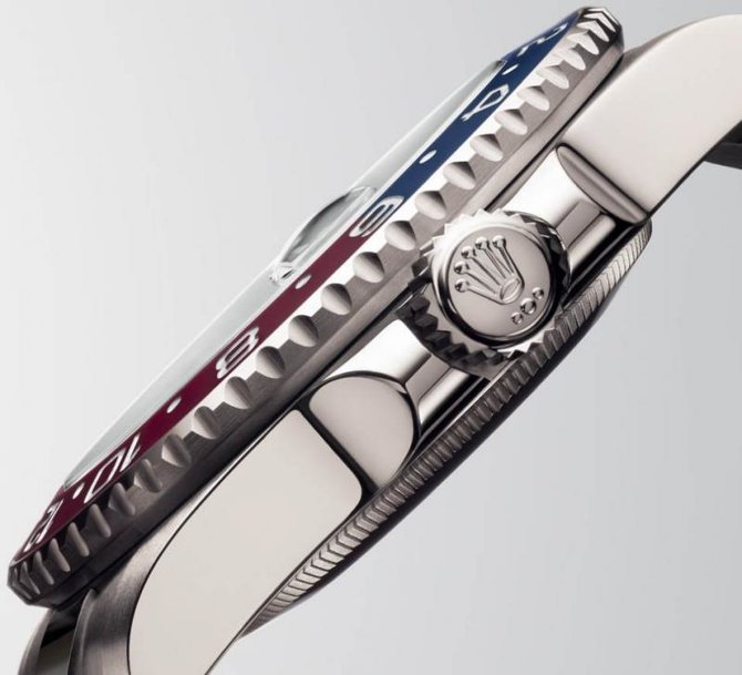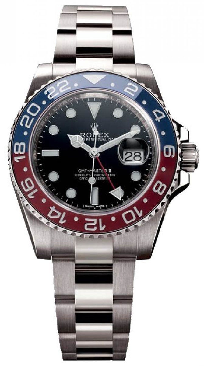 Новинка 2014. представлена на BaselWorld 2014. Ролекс представляет мировую премьеру – новую версию модели Oyster Perpetual GMT-Master II, оснащенную керамическим двухцветным красно-синим диском безеля Cerachrom, который сочетает в себе достижения высоких технологий и легендарную эстетику оригинальной модели 1955 года. Эта считающаяся ранее невозможной для керамики комбинация цветов стала сбывшейся мечтой для любителей этой знаковой модели. Техническое и эстетическое достижение – новый двухцветный красно-синий диск Cerachrom получен благодаря уникальному разработанному и запатентованному Ролексом методу, который позволяет получить в виде единого блока керамический компонент двух различных цветов, прокрашенный вглубь. Он напоминает традиционно двухцветные безели первоначальных GMT-Master и GMT-Master II. Это вдвойне исключительное инновационное достижение состояло в том, чтобы создать керамический диск красного цвета, что обычно чрезвычайно трудно получить, а затем проникнув вглубь, изменить химический состав каждого зерна вплоть до самых глубоких слоев керамики, чтобы превратить красный цвет в синий только на одной половине диска, создав при этом безупречно четкую границу разделения двух цветов. Диски Cerachrom, впервые примененные Ролексом в 2005 году, имеют то преимущество, что они обладают исключительной стойкостью к царапинам, высокой устойчивостью к коррозии и их цвет не изменяется под воздействием ультрафиолетовых лучей. Их полированная с помощью алмазных инструментов поверхность отличается неповторимым блеском. 24-часовая шкала, выгравированная в керамике, покрыта тончайшим слоем платины, нанесенной с помощью технологии PVD (Physical Vapor Deposition, технология конденсации паров металла).