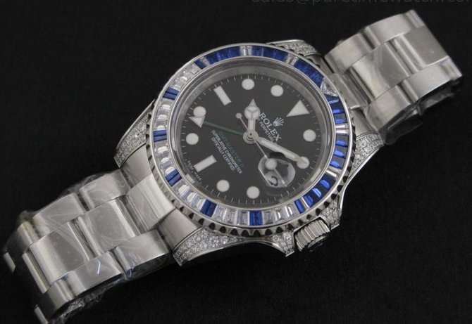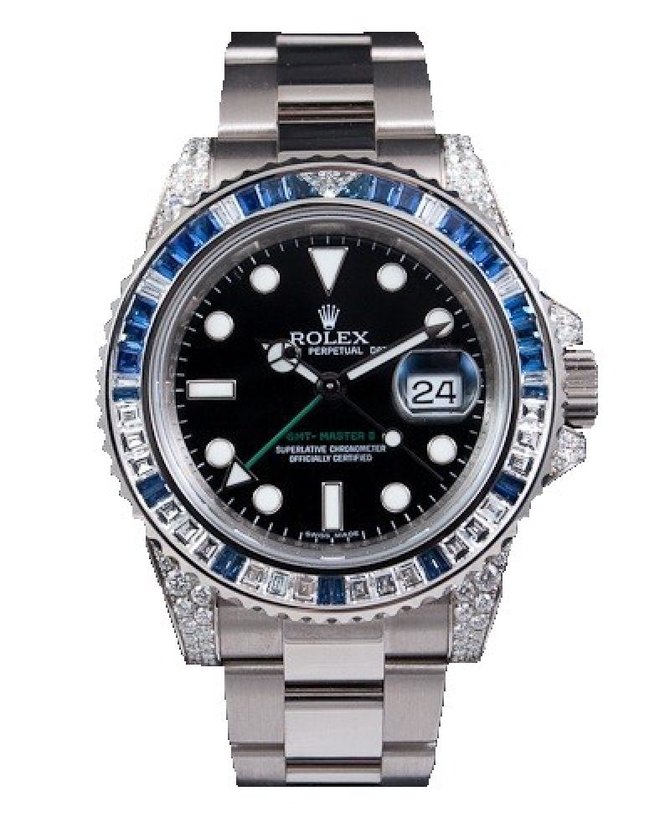 Новая модель GMT Master II. Циферблат черный. Браслет Oyster Fliplock из белого золота. Дополнительная информация - водонепроницаемость 100 м, вращающийся безель инкрустирован 29-ю белыми багетными бриллиантами и 30-ю синими багетными сапфирами, корпус инкрустирован 76-ю белыми бриллиантами.