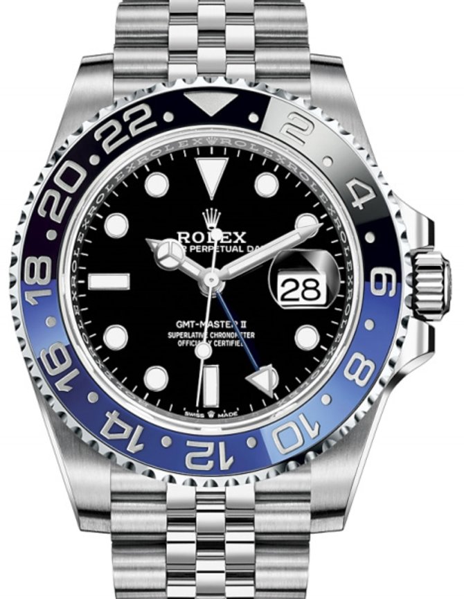 Швейцарские мануфактурные часы от марки Rolex - Oyster Perpetual GMT-Master II batman были выпущены в 2019 году. Модель отличается установленным механизмом с хронометрической точностью 3285, 70-часовым запасом хода, фирменной циклопной линзой на индикаторе даты и вращающимся двунаправленным безелем с двухцветной 24-часовой градуированной вставкой Cerachrom из черно-синей керамики. Корпус часов из нержавеющей стали имеет 100-метровый уровень герметичности. Стальной браслет дополнен раскладной застежкой. На циферблате часовая разметка и стрелки покрыты люминесцентным покрытием белого цвета, которое светится в темноте. Сертификат COSC подтверждает высокую хронометрическую точность механизма.