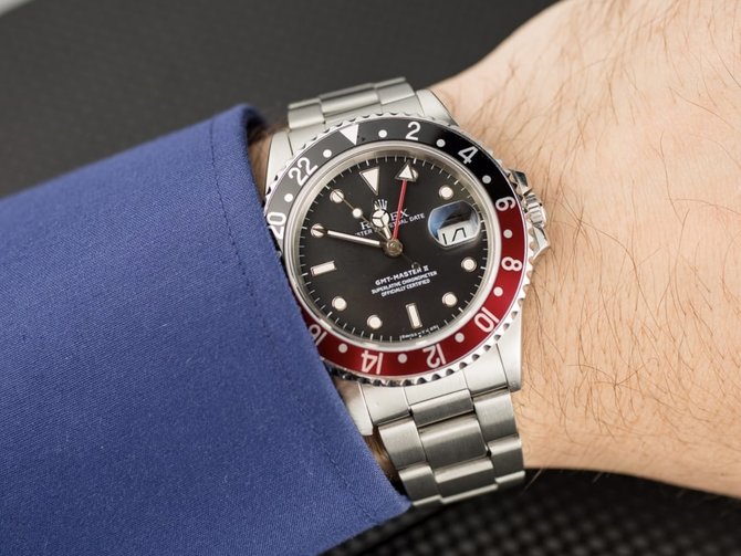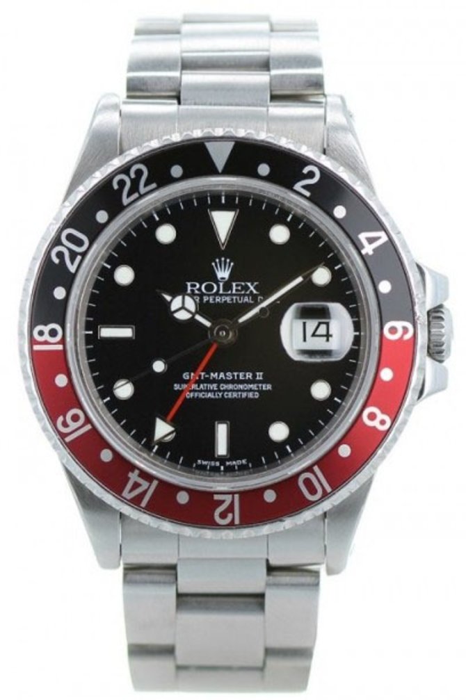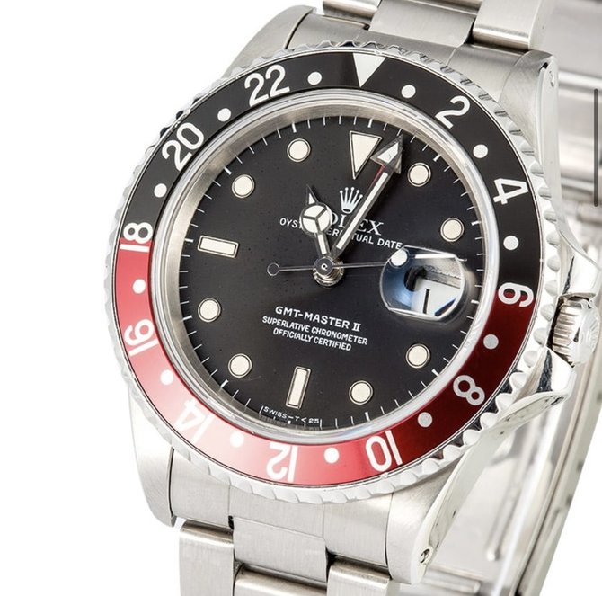 Швейцарские часы ROLEX GMT-MASTER II Fat Lady Coke (16760) были выпущены в 1988 году, однако часы находятся в идеальном состоянии. Круглый корпус, диаметром 40 мм, выполнен из нержавеющей стали и укомплектован стальным браслетом с раскладной пряжкой. Толщина корпуса 12 мм. Защитное стекло сапфировое. На индикатор даты установлена циклопная линза. Автоматический механизм Rolex Caliber 3085 с запасом хода на 42 часа служит для индикации времени 2-х часовых поясов, а также даты. Водонепроницаемость корпуса - 100 метров. Часовая разметка и стрелки покрыты люминесцентным составом. Название "Fat Lady" происходит от толстого корпуса, который намного больше, чем у предыдущих версий.