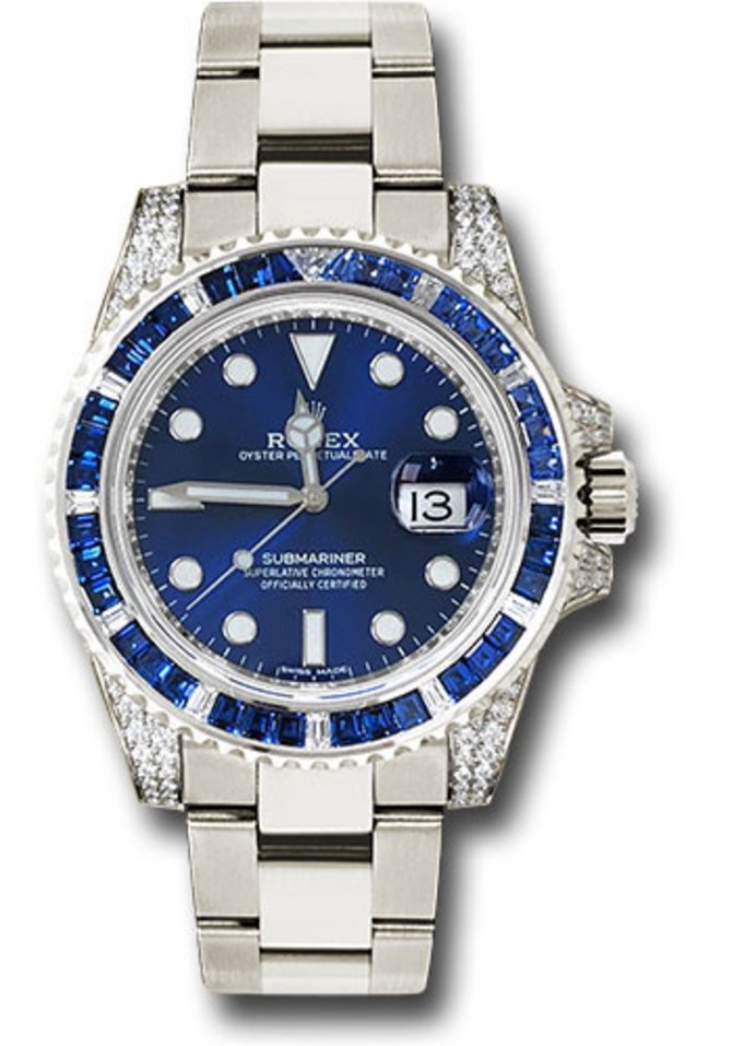 40-миллиметровый корпус швейцарских наручных часов Rolex White Gold Submariner Date Watch - Sapphire And Diamond Bezel - Blue Dial выполнен из 18-каратного белого золота. Корпус с обратной стороны закрыт завинчивающейся задней крышкой из белого золота. Корпус украшен белыми бриллиантами. Безель инкрустирован синими сапфирами. Циферблат, где показываются часы, минуты, секунды и дата, накрыт устойчивым к царапинам сапфировым стеклом. Увеличивающая показания цикопная линза установлена сверху индикатора даты. Модель оснащена автоматическим механизмом мануфактурной разработки Rolex - 3135 с запасом хода на 48 часов. Браслет Oyster с плоскими трехкомпонентными звеньями выполнен из белого золота и оснащен пряжкой типа Oysterlock с системой удлинения. Часы обладают высокой водонепроницаемостью до 300 метров.