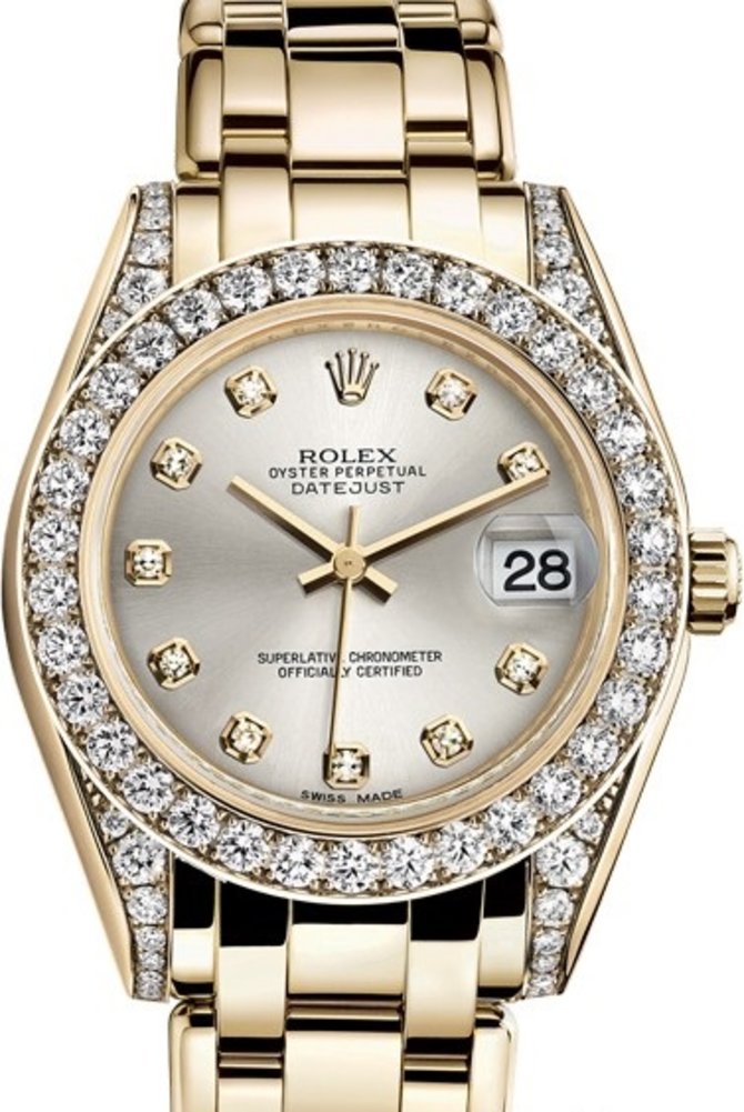 Швейцарская часовая мануфактура Rolex, выпускающая полмиллиона механических часов в год, представляет версию женских часов Pearlmaster Yellow Gold 34 mm в круглом корпусе из желтого золота, диаметром 34 мм, украшенном драгоценными камнями - белыми бриллиантами. На сатинированном циферблате в основе из желтого золота на местах цифр установлены бриллианты, заменяющие часовые метки, где золотыми стрелками показываются часы, минуты и секунды. На индикатор даты наложена циклопная линза, служащая для увеличения показаний. Механизм 2235 с автоматическим подзаводом и запасом хода на двое суток. Браслет из полированного золота доукомплектован раскладной пряжкой. Основное стекло сапфировое.
