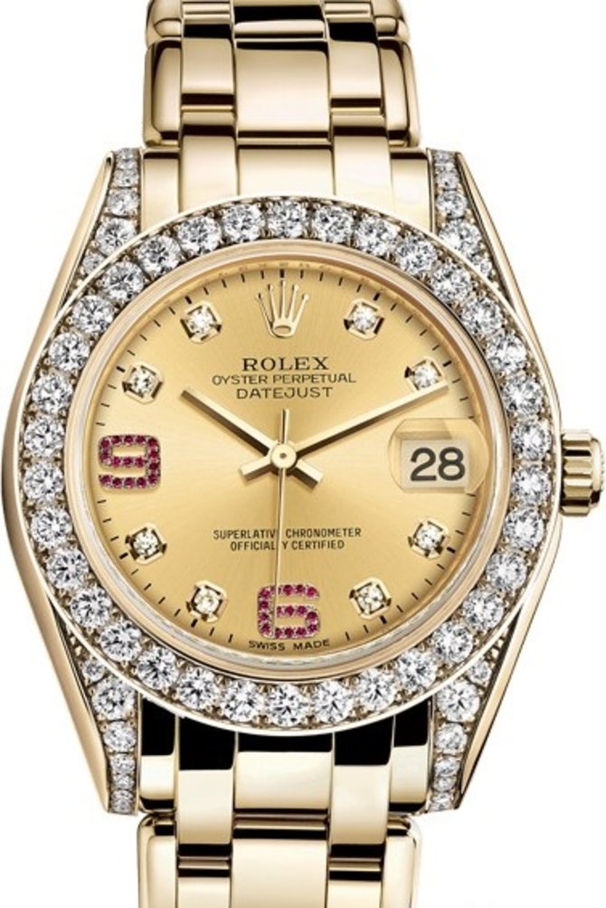 Модель швейцарских наручных часов Rolex Pearlmaster Yellow Gold 34 mm работает от мануфактурного механического калибра 2235 с автоматическим подзаводом, запас хода которого составляет 48 часов. Данный механизм был отмечен сертификатом высокой точности - сертификатом хронометра COSC. Корпус часов произведен в круглой форме из желтого золота, диаметром 34 мм и дополнен золотым браслетом и раскладной пряжкой также из золота. На золотистой основе циферблата установлены бриллианты в виде часовых меток, золотые стрелки и золотой логотип Rolex. К тому же, на циферблате присутствуют две арабские цифры - 6 и 9, которые инкрустированы красными рубинами. Водонепроницаемость ювелирного корпуса на уровне 100 метров.