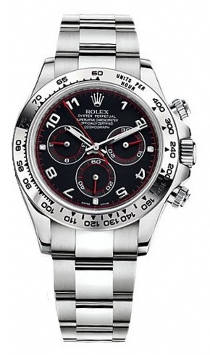 Точный хронограф Cosmograph Daytona создан для профессиональных автогонщиков. Безель с нанесением тахиметрической шкалы позволяет измерять скорость в пределах до 400 единиц в час. Корпус выполнен из 18-каратного белого золота. Собственное литейное производство Rolex дает возможность производить такие корпусы в пределах мануфактуры. Легендарный браслет Oyster выполнен из белого золота и оснащен раскладной застежкой Oysterlock из того же белого золота. Внутри корпуса стоит калибр 4130 с автоподзаводом и хронографом. Этот механизм полностью мануфактурный; имеет сертификат швейцарского хронометра, выданный COSC. Водонепроницаемость корпуса - до 100 метров. Корпус цельный, с привинчиваемой крышкой и заводной головкой. Диаметр корпуса - 40 мм. Безель фиксированный. Заводная головка наделена системой тройной герметизации Triplock. Стекло сапфировое, устойчивое к появлению царапин. Запас хода механизма - до 72 часов.
