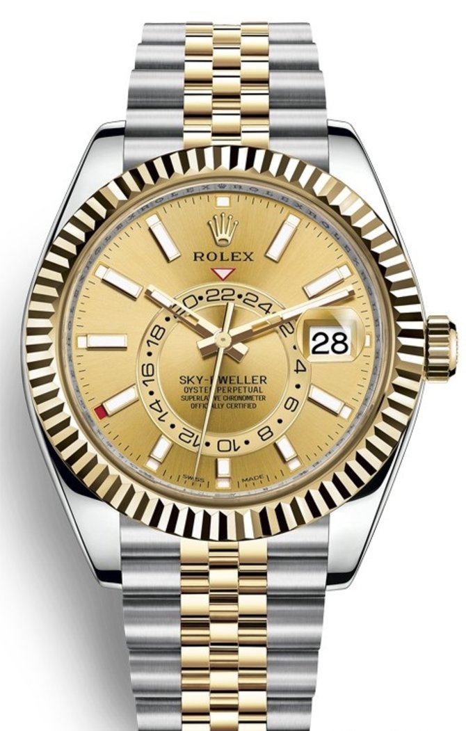 Наручные швейцарские часы от компании Rolex - Sky-Dweller 42mm Steel and Yellow Gold 326933-0004 представлены на базе мануфактурного механического калибра 9001 со статусом хронометра швейцарского института хронометрии COSC. Корпус выполнен из желтого золота и нержавеющей стали в диаметре 42 мм. Запас хода рассчитан на 72 часов. Часы отличаются функцией GMT - индикации времени двух часовых поясов. На золотистом циферблате указываются часы, минуты, секунды, дата. Циферблат защищен сапфировым стеклом с противобликовым составом. Циклопная линза, запатентованная Rolex-ом, служит для увеличения показаний даты. Комбинированный браслет дополнен раскладной застежкой. Часовая разметка и стрелки сделаны из золота и покрыты люминесцентным составом. Водонепроницаемость корпуса - 100 метров.
