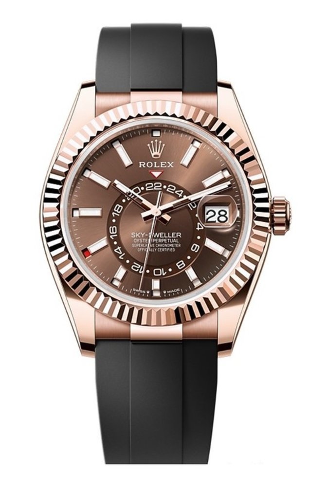 Наручные швейцарские часы от компании Rolex, модель Sky-Dweller Sky-Dweller 42mm Everose Gold 336235-0002, представлены в круглом корпусе из розового золота. В комплекте с часами поставляется черный каучуковый ремень и золотая пряжка. Под стеклом из сапфирового кристалла показываются часы, минуты, секунды двух часовых поясов, а также дата и месяц. Часовые метки со стрелками покрыты люминесцентным составом. Безель рифленый, вращающийся. Установленный мануфактурный механизм 9002 обладает сертификатом хронометрической точности хода, запасом хода на 72 часа работы без подзавода. Водонепроницаемость корпуса - 100 метров. Часы выпущены в 2023 году.