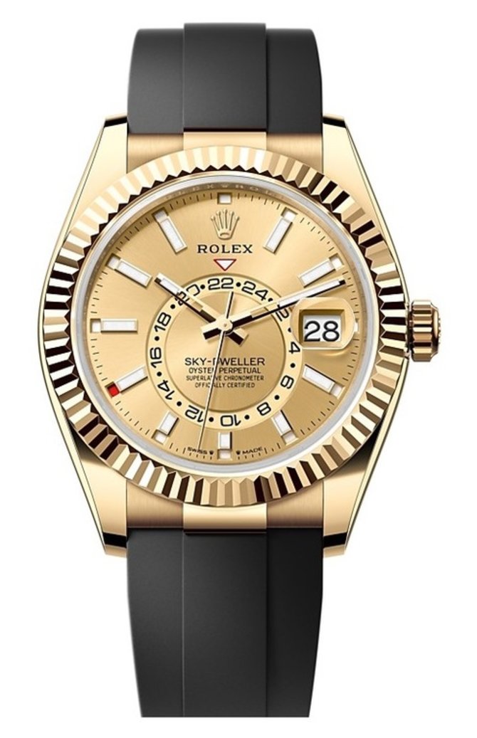 Наручные швейцарские часы от компании Rolex, модель Sky-Dweller Sky-Dweller 42mm Yellow Gold 336238-0001, представлены в круглом корпусе из желтого золота. В комплекте с часами поставляется черный каучуковый ремень и золотая пряжка. Под стеклом из сапфирового кристалла показываются часы, минуты, секунды двух часовых поясов, а также дата и месяц. Часовые метки со стрелками покрыты люминесцентным составом. Безель рифленый, вращающийся. Установленный мануфактурный механизм 9002 обладает сертификатом хронометрической точности хода, запасом хода на 72 часа работы без подзавода. Водонепроницаемость корпуса - 100 метров. Часы выпущены в 2023 году.