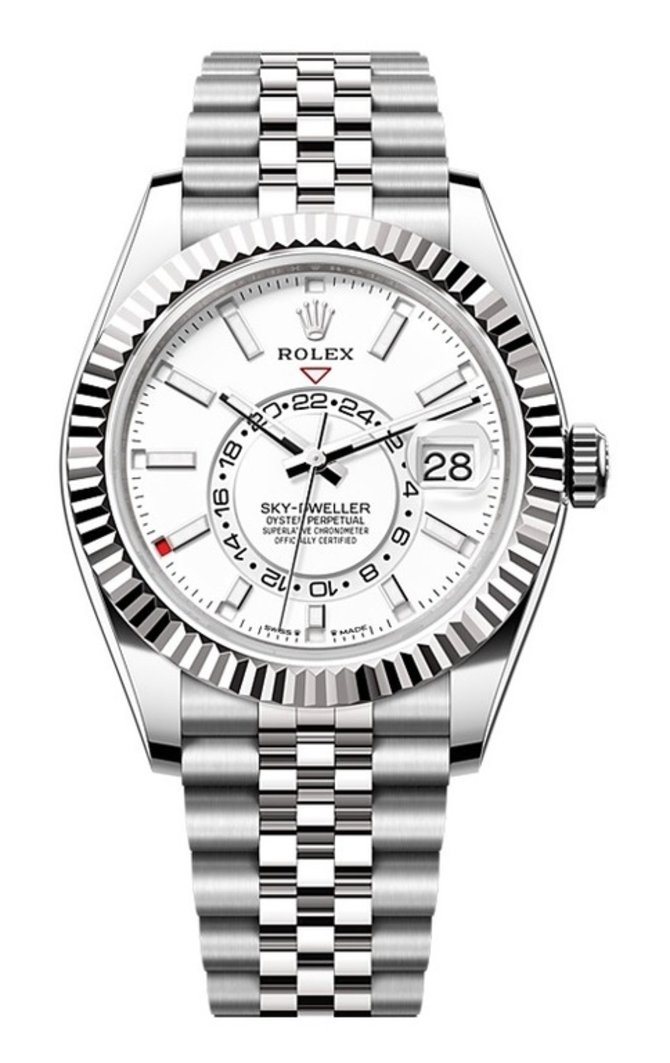 Часовая марка Rolex в 2023 году представила швейцарские мужские наручные часы Sky-Dweller 42 mm Steel and White Gold 336934-0004 в круглом комбинированном 42-миллиметровом корпусе из белого золота и нержавеющей стали с герметичностью на 100 метров. Мануфактурный автоматический механизм 9002 от Rolex имеет сертификат хронометрической точности хода, запас хода на 72 часа работы, индикатор даты, месяца и стрелки для индикации текущего времени. Также часы оснащены функцией второго времени. Над индикатором даты размещена циклопная линза Rolex, увеличивающая показания. Часовые метки и стрелки покрыты люминесцентным составом, что светится в темноте. Защитное стекло изготовлено из сапфирового кристалла и покрыто антибликовым составом. Безель вращающегося типа. Комбинированный браслет из белого золота и нержавеющей стали дополнен раскладной застежкой.