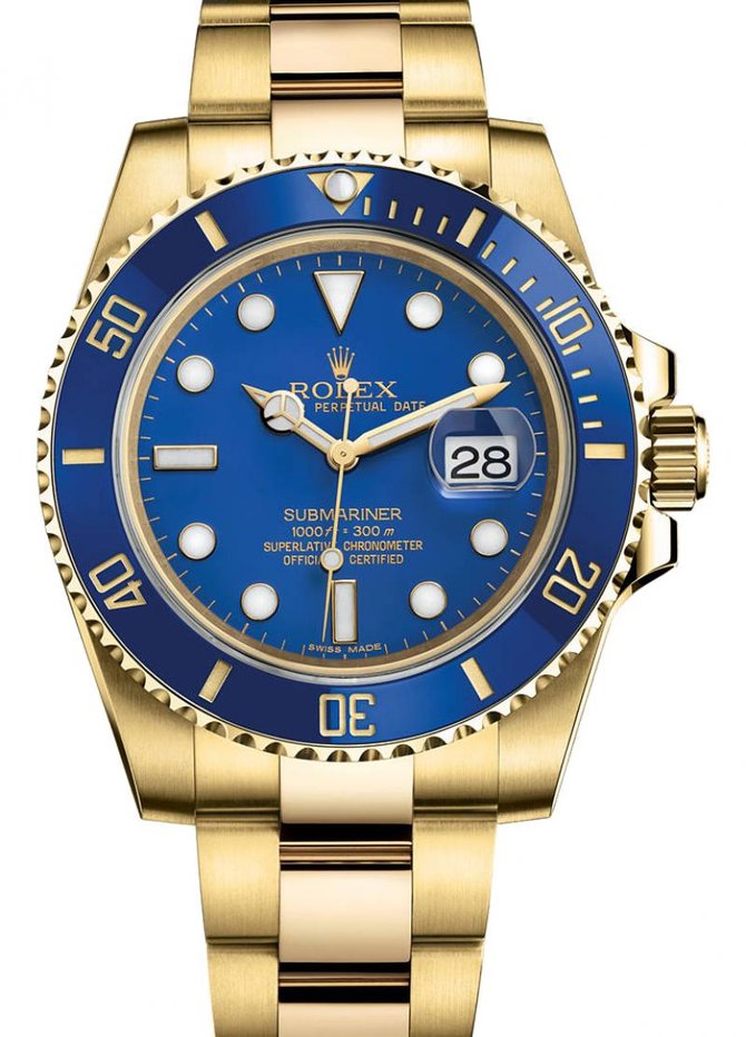 Rolex Oyster Perpetual Submariner являются образцом часов для подводного плавания. Увидев свет в 1953 году, в эпоху зарождения подводного плавания, они стали первыми часами, способными сохранять водонепроницаемость до глубины 100 метров. С тех пор легендарная модель была оснащена целой серией запатентованных компанией Rolex технических инноваций, гарантирующих надежность и точность хода на глубине до 300 метров. В безбрежных просторах океана они остаются незаменимым спутником каждого дайвера, завоевав репутацию часов, созданных для движения и отличающихся строгой элегантностью. Вращающийся безель является главной отличительной особенностью часов Submariner. Его выгравированная 60-минутная шкала обеспечивает дайверу точные и надежные показания времени погружения и декомпрессионных остановок. Безель Cerachrom, изготовленный компанией Rolex из сверхпрочной керамики, великолепно противостоит коррозии и надежно защищен от царапин. Люминесцентная капсула на нулевой отметке обеспечивает читаемость показаний независимо от освещенности окружающей среды. Рифленые грани безеля способствуют его оптимальному захвату под водой, даже в перчатках. Индикация Chromalight на циферблате часов значительно улучшает читаемость показаний в темноте. Ровное голубое свечение поддерживается до восьми часов, что практически в два раза дольше, чем могут обеспечить традиционные люминесцентные вещества. Циферблат синего цвета.