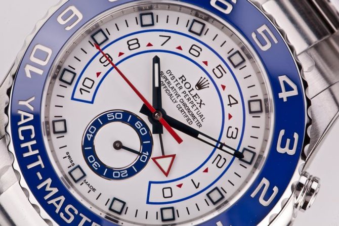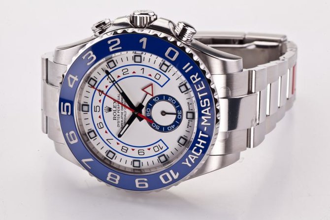 Модель Oyster Perpetual Yacht-Master II представляет собой уникальный яхтенный хронограф, предназначенный как для участников регат, так и для всех любителей парусного спорта. Модель 116680 Yacht-Master II 44 mm Steel имеет такие особенности: водостойкие, хронограф, хронометр. Циферблат - белый с синим. Запас хода 72 часа. Дополнительная информация: водонепроницаемость 100 м, вращающийся керамический безель, позволяющий программировать обратный отсчет. Продажа наручных часов Rolex Yacht-Master Yacht-Master II Chronograph 2013 ref. 116680 Уникальный хронограф для участников регат, созданный компанией Rolex в 2007 году, впервые в 2013 году предлагается в корпусе из стали 904L с синим керамическим безелем Cerachrom. Высокоточный часовой инструмент, созданный как для профессиональных рулевых, так и для любителей парусного спорта, новая модель Yacht-Master II представляет собой средоточие ноу-хау компании Rolex с точки зрения точности, функциональности и надежности.Модель Yacht-Master II обладает уникальной функцией, разработанной компанией Rolex: счетчиком обратного отсчета, программируемым на отрезке от 1 до 10 минут, с механической памятью, позволяющей вернуться к запрограммированному отрезку времени в момент повторного введения данных. Кроме того, он может быть синхронизирован прямо на ходу, чтобы можно было вписаться в официальный счет регаты.Это устройство прекрасно отвечает необходимости проведения точных замеров времени в решающий момент старта, причем его техническая сложность сочетается с крайней простотой использования. Действительно, программирование активизируется с помощью поворотного безеля Ring Command, разработанного Rolex новаторского интерфейса, обеспечивающего взаимодействие безеля с ходовым механизмом. Корпус Oyster является одной из главных составляющих репутации Rolex, став для многих стандартом совершенства в часовом искусстве. Изобретенный компанией Rolex в 1926 году, он ста