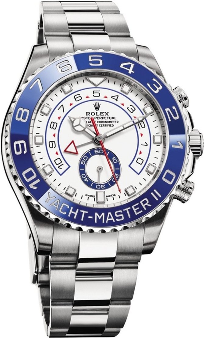 Часы Rolex Yacht-Master II 44 mm Steel 116680 с вращающимся керамическим безелем, позволяющим программировать обратный отсчет. Корпус мануфактурных часов выполнен из нержавеющей стали, с размерами 44 x 14 мм. Калибр 4161 с автоподзаводом, хронографом, сертификатом хронометра COSC. Индикация - текущее время в часах, минутах и секундах. Циферблат выполнен в сине-белых тонах. Браслет стальной, с раскладной пряжкой. Горпус имеет 100-метровую водостойкость. Не малую роль в герметичности играет лицевое защитное стекло, которое выполнено из сапфира. Запас хода механического калибра - 72 часа.