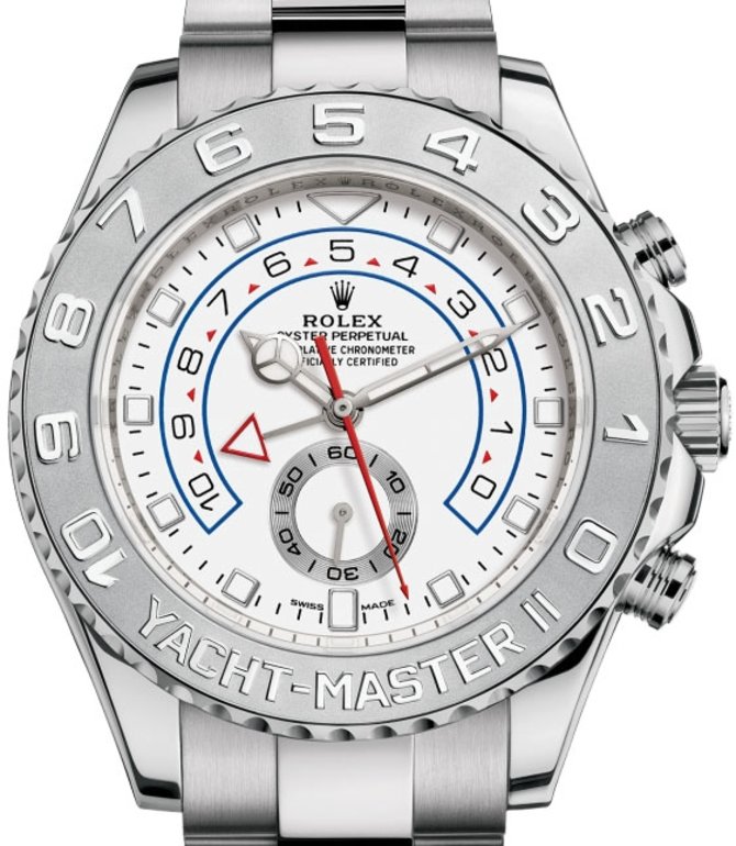 Модель, представленная маркой Rolex, обладает корпусом, выполненным в комбинации платины и белого 18-каратного золота. На циферблате под стеклом из сапфира показываются часы, минуты, секунды и хронограф с функцией регата. Запас хода механизма рассчитан на 3 суток. Герметичность корпуса - 100 метров. Браслет, которым укомплектована модель Yacht-Master II Regatta Chronograph White Gold and Platinum, изготовлен из белого золота. Калибр 4130 мануфактурного производства Rolex работает от автоматического подзавода.
